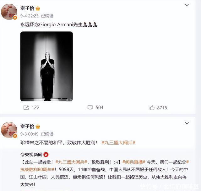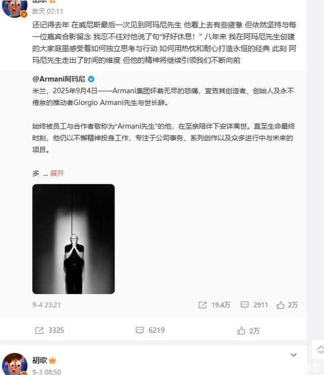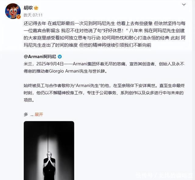 但不知轻重这块上,这就让不少的网友有点受不了,这并非针对阿玛尼本人,而是对国家的祝福和对这位老外的哀悼就隔了一天的情况下,字里行间的重视程度有明显差距。 动态上我们就可以看到,胡歌本人在9月4日,悼念这位外国设计师的时候,写了几百字的小作文,