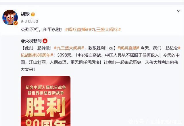 但叫人没想到的是,之前9月3日的时候,他对于九三的大阅兵和胜利八十周年这一事,反而只是俩成语四个字带过, 这就像极了很多的上班打卡的一样,单纯做完发了,然后就完事了。