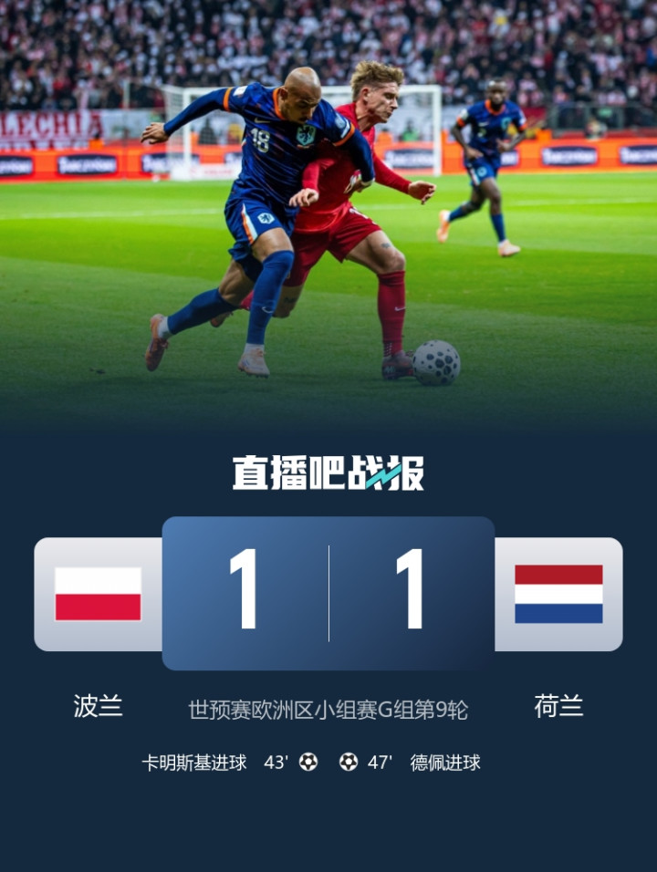 世预赛G组第9轮,荷兰1-1战平波兰,无缘提前出线。