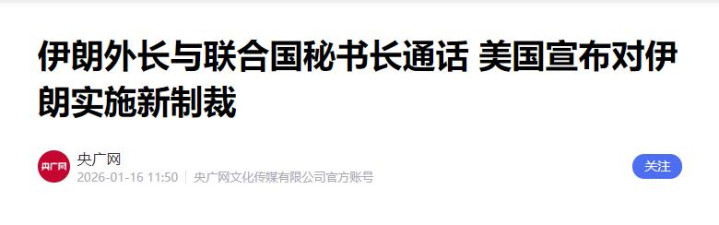 中新网报道:《美国财政部宣布对伊朗实施新制裁》2026年1月16日